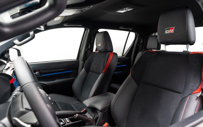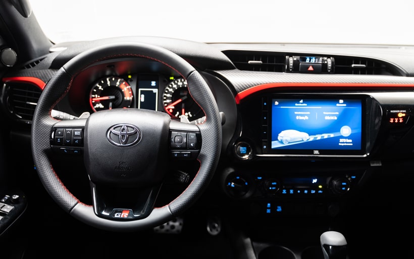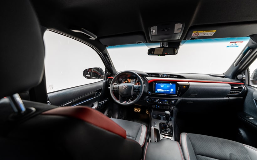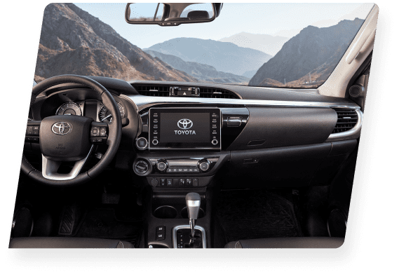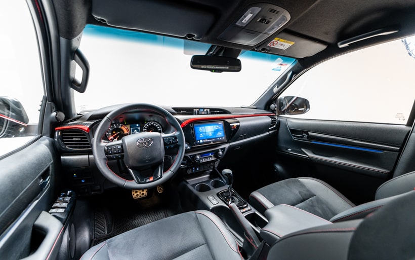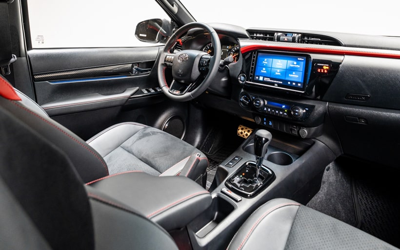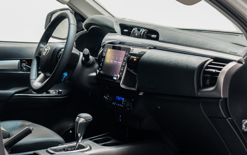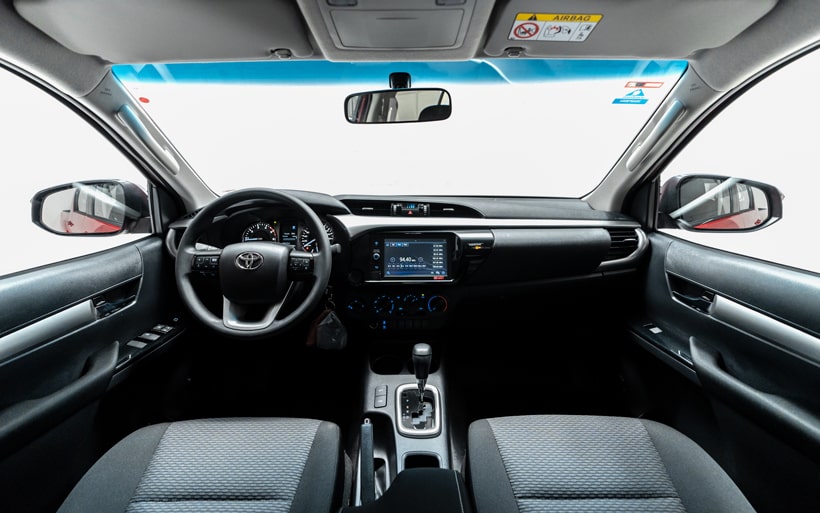 En su interior, la nueva Hilux combina dinamismo y modernidad, integrándose el equipo de audio de manera más fluida al panel de instrumentos. El nuevo diseño y combinación de colores de los relojes de velocímetro y tacómetro, donde predomina ahora el gris, negro y blanco, contribuyen a renovar la atmósfera interior.